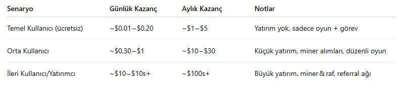 Ancak burada önemli nokta: "yüksek yatırım + çok sayıda miner + referral ağı + aktif oyun" birleşimi olması. Yatırımı olmayan bir kullanıcı için bu seviyeye ulaşmak çok daha uzun sürecektir.